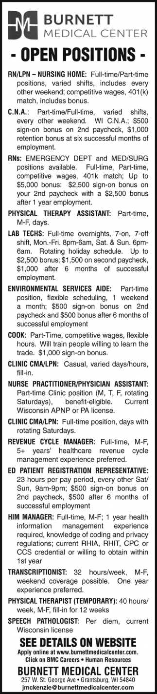 Rn Lpn Cna Lab Techs Burnett Medical Center Grantsburg Wi